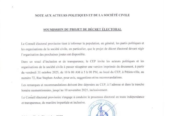 Le Conseil électoral provisoire (CEP) a annoncé, ce jeudi 30 octobre 2025, la mise à disposition d’un projet de décret électoral destiné à encadrer l’organisation des prochaines élections en Haïti. Dans un communiqué adressé aux acteurs politiques et à la société civile, l’institution souligne son intention de promouvoir inclusion, transparence et participation citoyenne dans la…