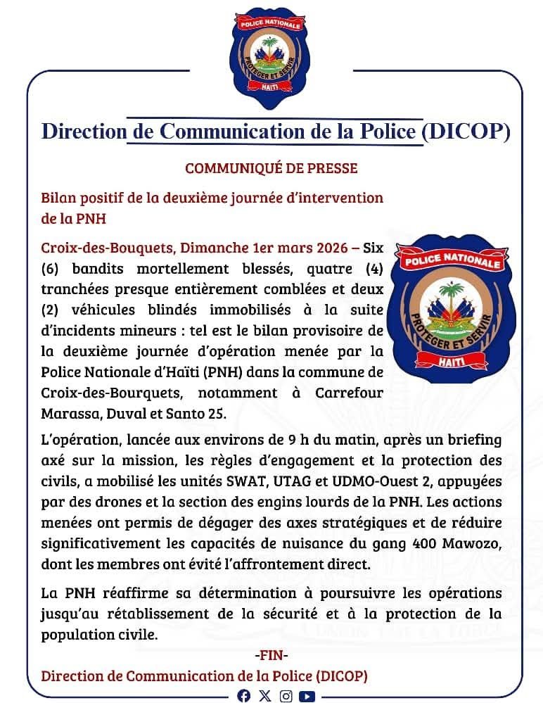 La Police nationale d’Haïti (PNH) dresse un bilan jugé positif de la deuxième journée d’opération menée à Croix-des-Bouquets, dans le cadre de la lutte contre l’insécurité armée. Selon les autorités policières, six individus présentés comme des membres de groupes criminels ont été neutralisés, tandis que quatre tranchées érigées pour entraver l’accès des forces de l’ordre ont été comblées. Deux véhicules blindés utilisés par les assaillants ont également été immobilisés.