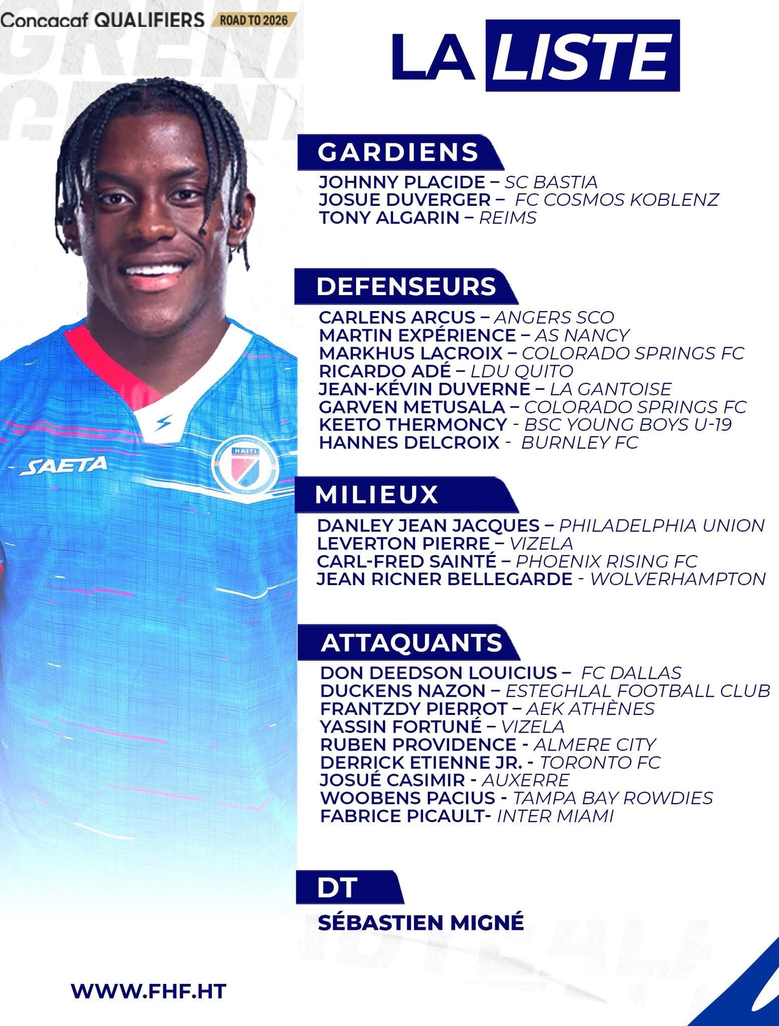 Autre fait marquant : le retour très attendu de Derrick Étienne. Écarté de la sélection nationale depuis plus d’un an, l’ailier signe un come-back symbolique, reflet d’un groupe en pleine phase de reconstruction. Dans les cages, la première convocation du jeune Tony Algarin (FC Metz) représente une étape importante dans sa jeune carrière. Il rejoint un trio de gardiens aux profils complémentaires, aux côtés du vétéran Johny Placide et de Josué Duverger, auteur d’une prestation convaincante lors du match nul spectaculaire face au Costa Rica (3-3).