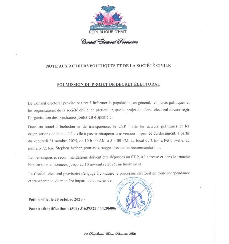 Pour permettre un examen large et approfondi, le CEP invite les partis politiques, organisations de la société civile et citoyens intéressés à retirer une version imprimée du projet de décret à son siège, situé au 72, rue Stephen Archer, Pétion-Ville. La distribution débutera vendredi 31 octobre 2025, de 10 heures à 17 heures.