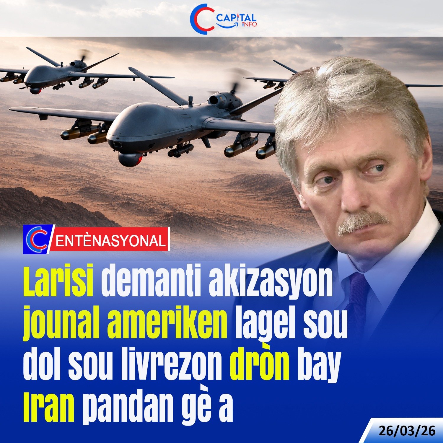 Dirijan peyi Larisi demanti enfòmasyon jounal ameriken Financial Times (FT) te rapòte, ki fè konnen peyi a ta voye dròn bay Iran an kachèt, pandan lagè k ap fèt nan Mwayen Oryan an.
